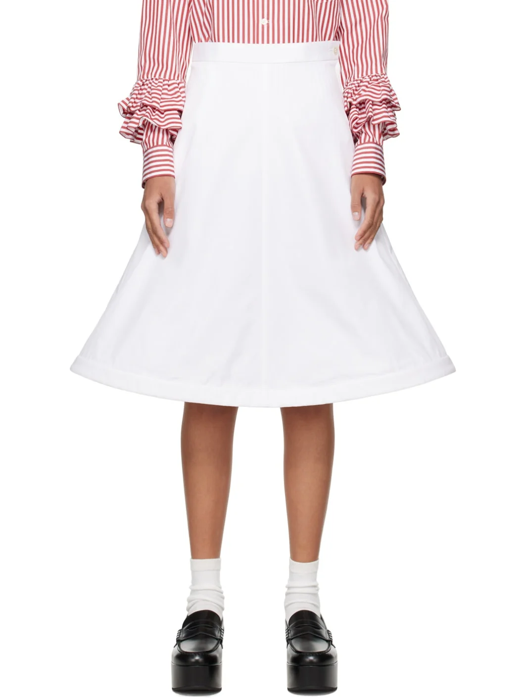 Cotton broadcloth skirt. · Single-pocket styling · Concealed wire at structured flared hem · Concealed zip closure at side Supplier color: White 100% cotton. Made in Japan 242670F092003