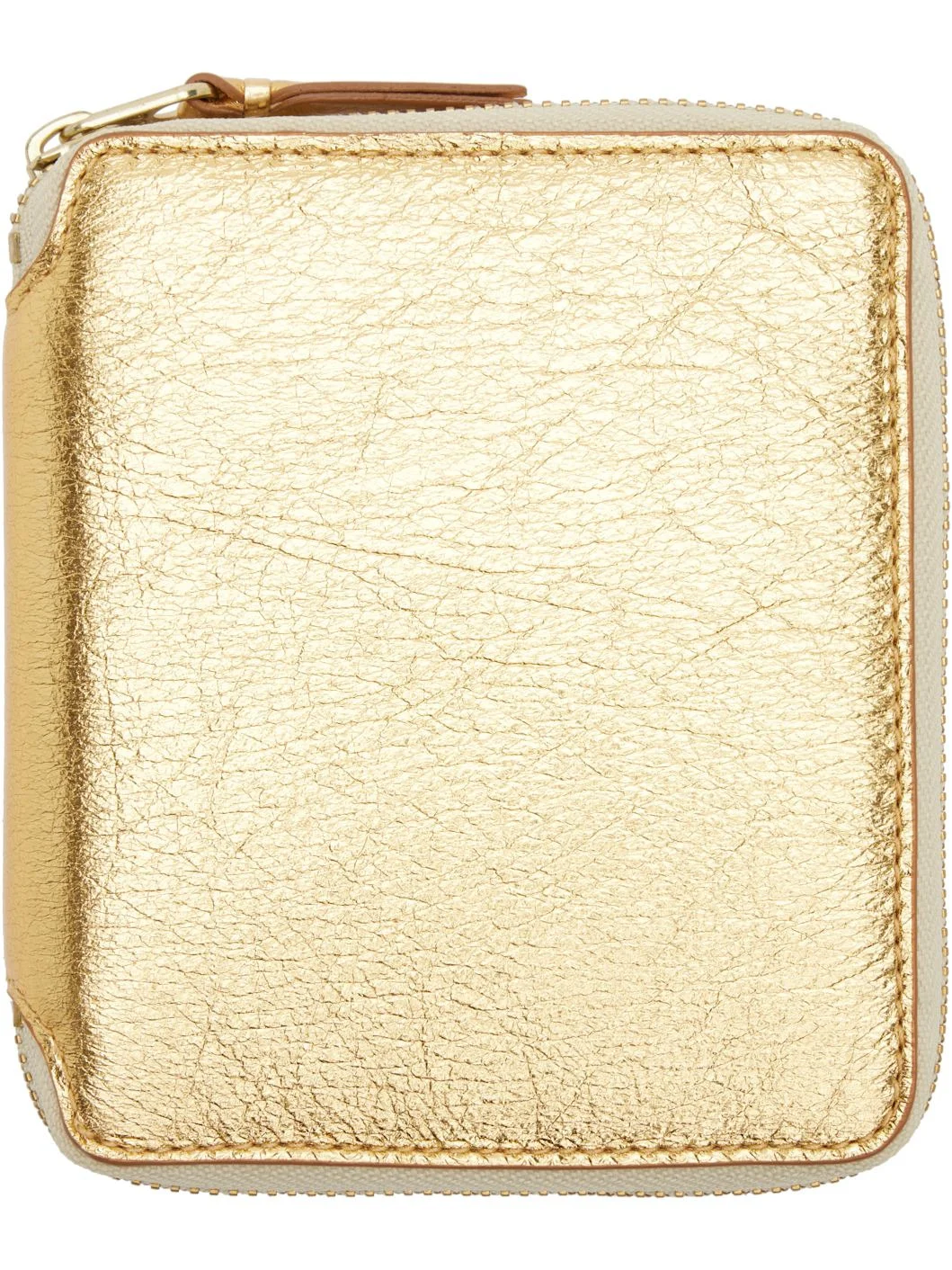Crinkled leather bifold wallet. · Zip closure · Four card slots · Two patch pockets · One note slot · Flap coin compartment · H4.25" x W4.75" x D1" Supplier color: Gold Leather. Made in Spain 261230F040004