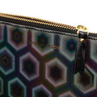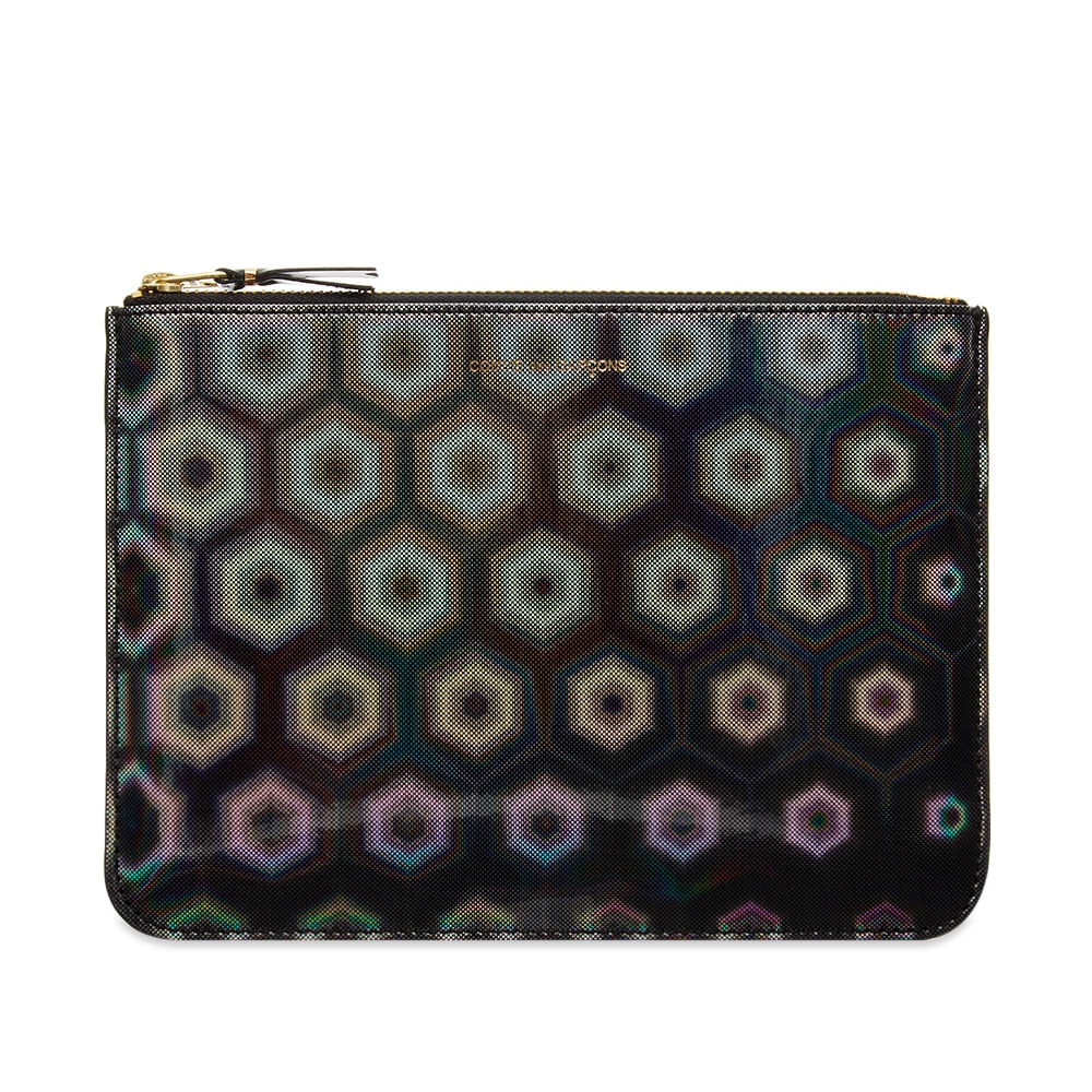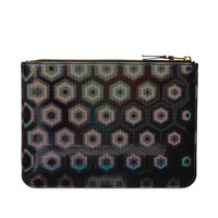 A handy wallet for your small essentials, this Comme des Garcons accessory is updated with a futuristic-inspired holographic design. Styled with an iridescent sheen, it features a gold-tone zipper and tonal branding to match. - 60% Polyurethane, 40% Polyester - Cowhide Leather Lining - Zip Closure - Printed Branding - Made in Spain