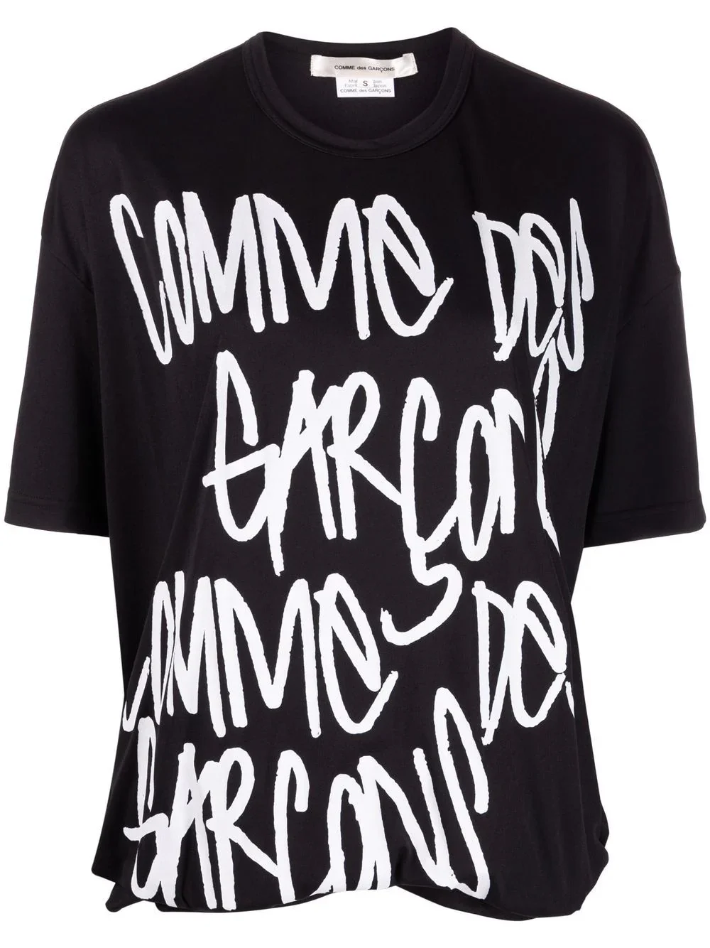 logo-print T-shirt Decorated with a scrawling logo print to its front, this black short-sleeve T-shirt features a warped hem, showcasing Comme des Garcons' penchant for experimental silhouettes. Imported Composition Polyester 100% SIZE & FIT Model measurements Height 5 ft 9 in(1.75 m) Bust/Chest 31.49 in(80 cm) Hips 34.64 in(88 cm) Waist 24.01 in(61 cm) FittingInformation This piece fits true to size. We recommend you get your regular size Cut for a loose fit Made with a mid-weight fabric Washing instructions Hand Wash