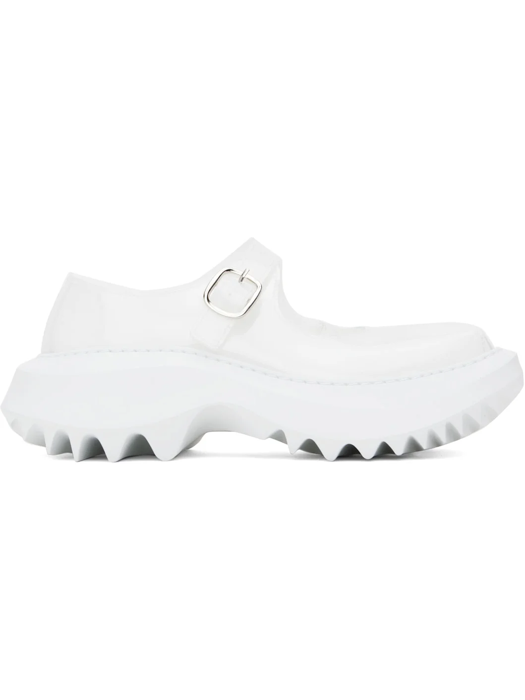 Low-top semi-transparent vinyl Mary Jane-style sneakers in white. · Pin-buckle strap at vamp · Eyelet at inner side · Bonded fleece lining · Sculptural foam rubber midsole · Treaded rubber sole · Heel: H2.5" Part of the Comme des Garcons x Phileo collaboration. Supplier color: White Upper: polyvinyl chloride. Sole: rubber. Made in Portugal 251245F128002