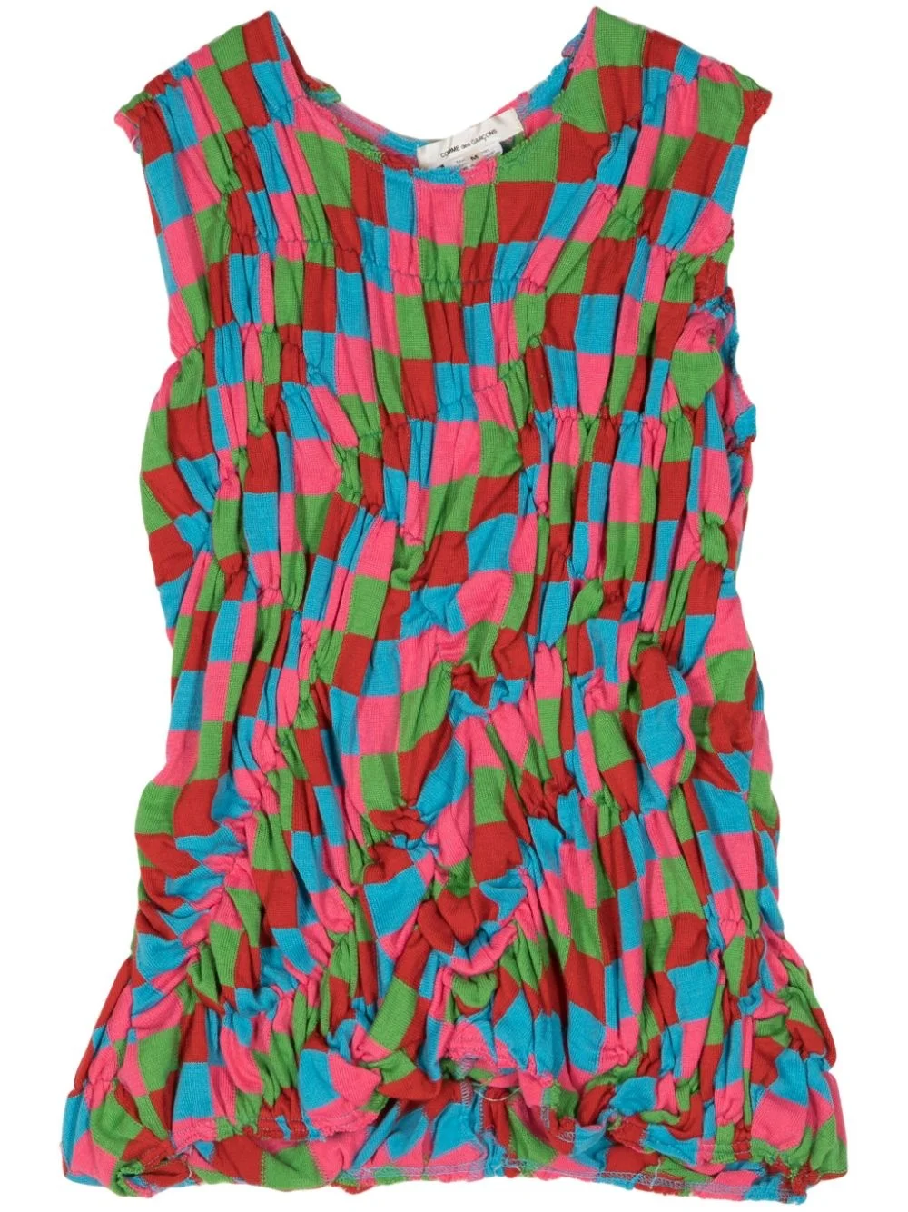 check-pattern ruched top multicolour check pattern fine knit ruched detailing raw-cut finish round neck sleeveless asymmetric hem Imported Composition Acrylic 60%, Wool 40%