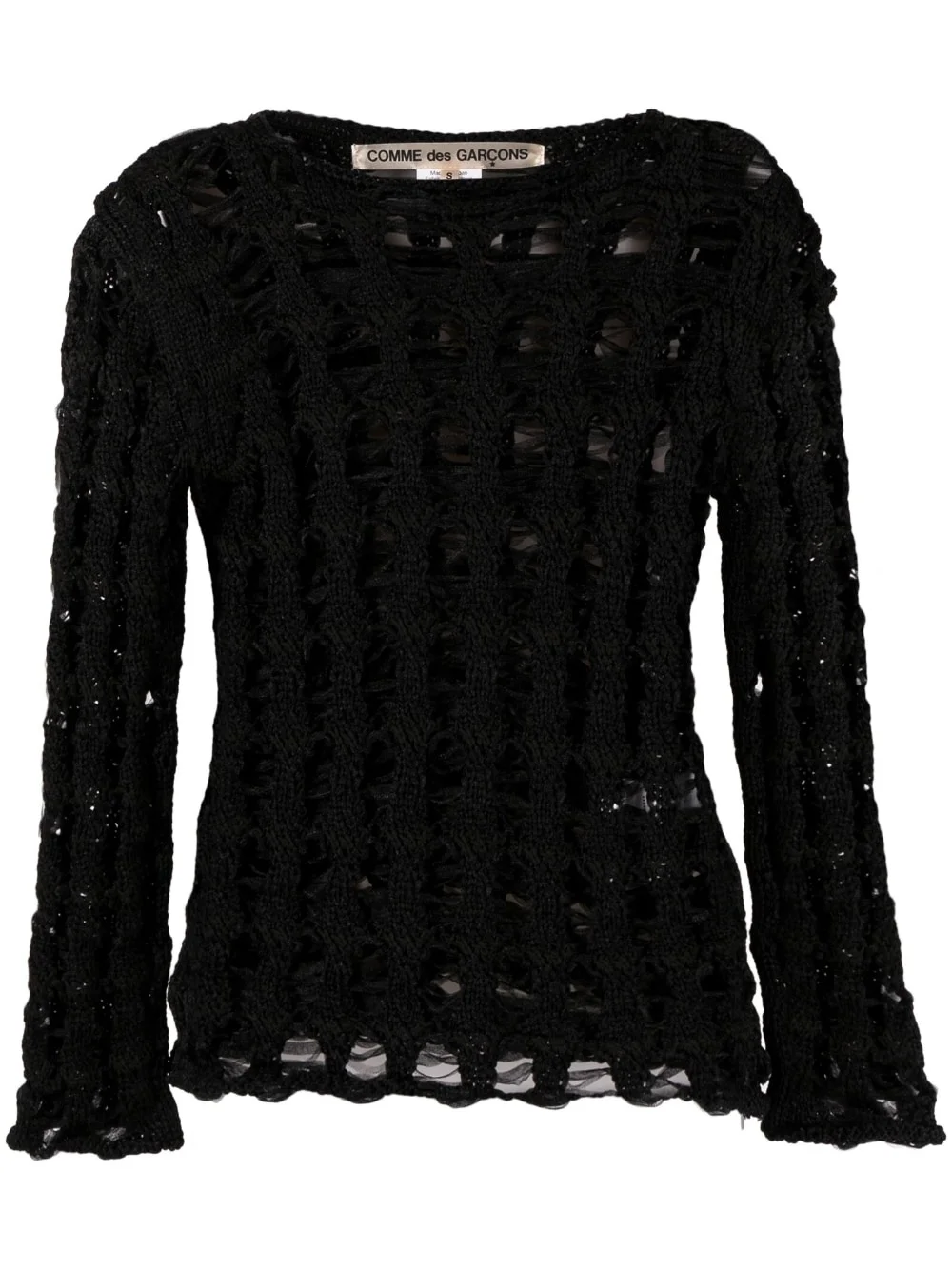 open-knit jumper This black jumper from Comme des Garcons speaks to the label’s off-beat aesthetic. It’s crafted to a bold open-knit construction. Highlights - Black - Open knit - Round neck - Long sleeves - Straight hem Imported Composition Nylon 88%, Polyester 12% SIZE & FIT Model measurements Height 5 ft 11 in(1.8 m) Bust/Chest 31.49 in(80 cm) Hips 35.82 in(91 cm) Waist 24.8 in(63 cm) FittingInformation Designed for a slim fit that sits just away from the body offering a close yet comfortable fit Made with a midweight knit, this piece offers some stretch This piece fits true to size – take your usual size Washing instructions Hand Wash