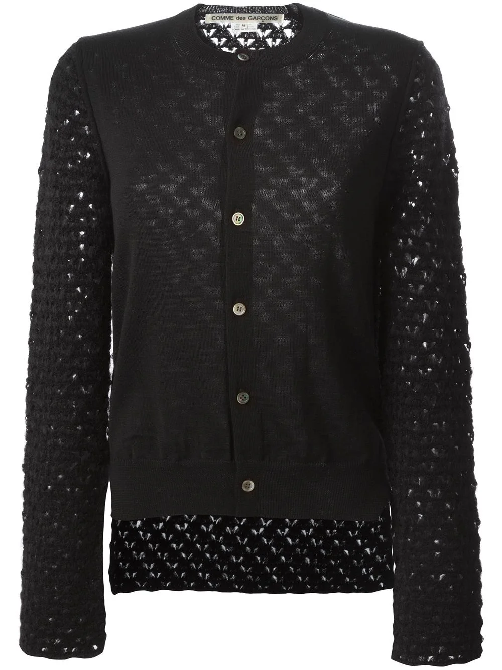 open knit sleeve cardigan Black mohair-wool blend open knit sleeve cardigan from Comme Des Garcons. Imported Composition Wool 55%, Mohair 35%, Nylon 10% SIZE & FIT Model measurements Height 5 ft 10 in(1.79 m) Bust/Chest 32.67 in(83 cm) Hips 33.46 in(85 cm) Waist 24.01 in(61 cm) Washing instructions Dry Clean Only