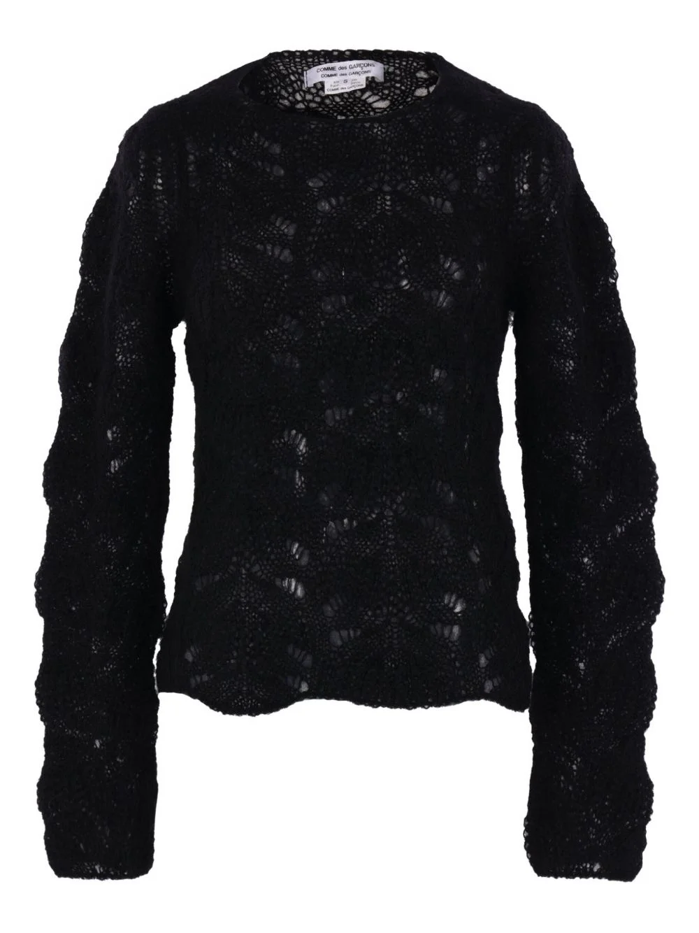 open-work long-sleeve sweater Highlights - Black - Openwork pattern - Crew neck - Long sleeves Imported Composition Mohair 55%, Nylon 30%, Wool 15% Washing instructions Read Manufacturer Guidelines