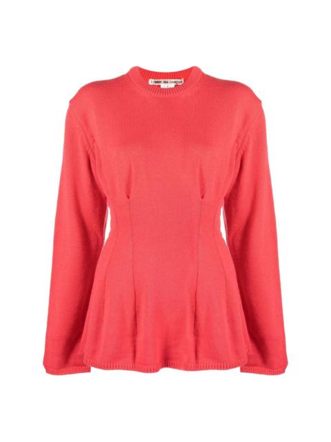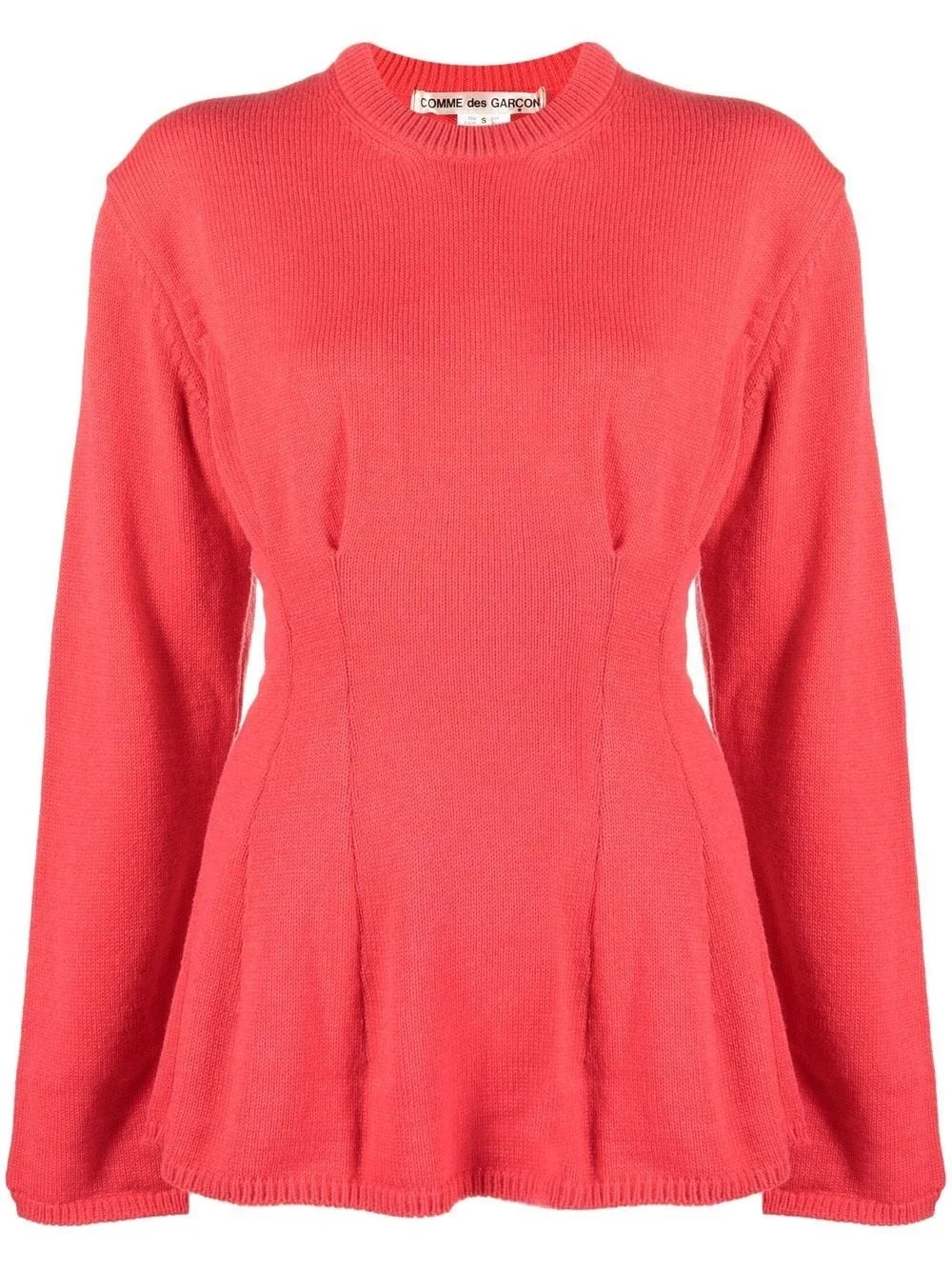 peplum-hem crew neck jumper Comme des Garcons' penchant for experimental silhouettes is illustrated by this crew neck jumper. A contemporary structure is created by its peplum hem and cinched waist. Imported Composition Acrylic 70%, Wool 30% SIZE & FIT Model measurements Height 5 ft 10 in(1.78 m) Bust/Chest 29.92 in(76 cm) Hips 34.64 in(88 cm) Waist 23.62 in(60 cm) FittingInformation This piece fits true to size. We recommend you get your regular size Cut for a slim fit Made with a mid-weight fabric Washing instructions Dry Clean Only