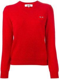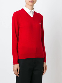 embroidered heart sweater Red wool embroidered heart sweater from Comme Des Garcons Play. Imported Composition Wool 100% SIZE & FIT Model measurements Height 5 ft 10 in(1.77 m) Bust/Chest 32.67 in(83 cm) Hips 34.25 in(87 cm) Waist 22.44 in(57 cm) FittingInformation Designed for a relaxed fit, this piece allows for comfort and movement when worn Made with a midweight knit, this piece offers some stretch This piece fits small – take one size up Washing instructions Dry Clean Only