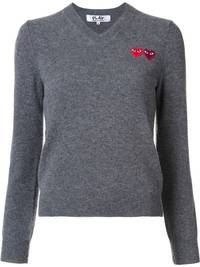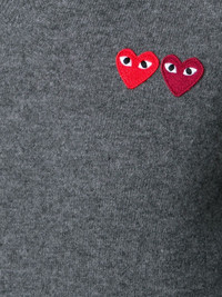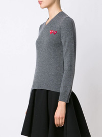 double heart v-neck jumper Grey wool double heart v-neck jumper from Comme Des Garcons Play. Imported Composition Outer: Wool 100% SIZE & FIT Model measurements Height 5 ft 10 in(1.77 m) Bust/Chest 33.85 in(86 cm) Hips 35.03 in(89 cm) Waist 24.01 in(61 cm) FittingInformation Designed for a relaxed fit, this piece allows for comfort and movement when worn Made with a midweight knit, this piece offers some stretch This piece fits small – take one size up