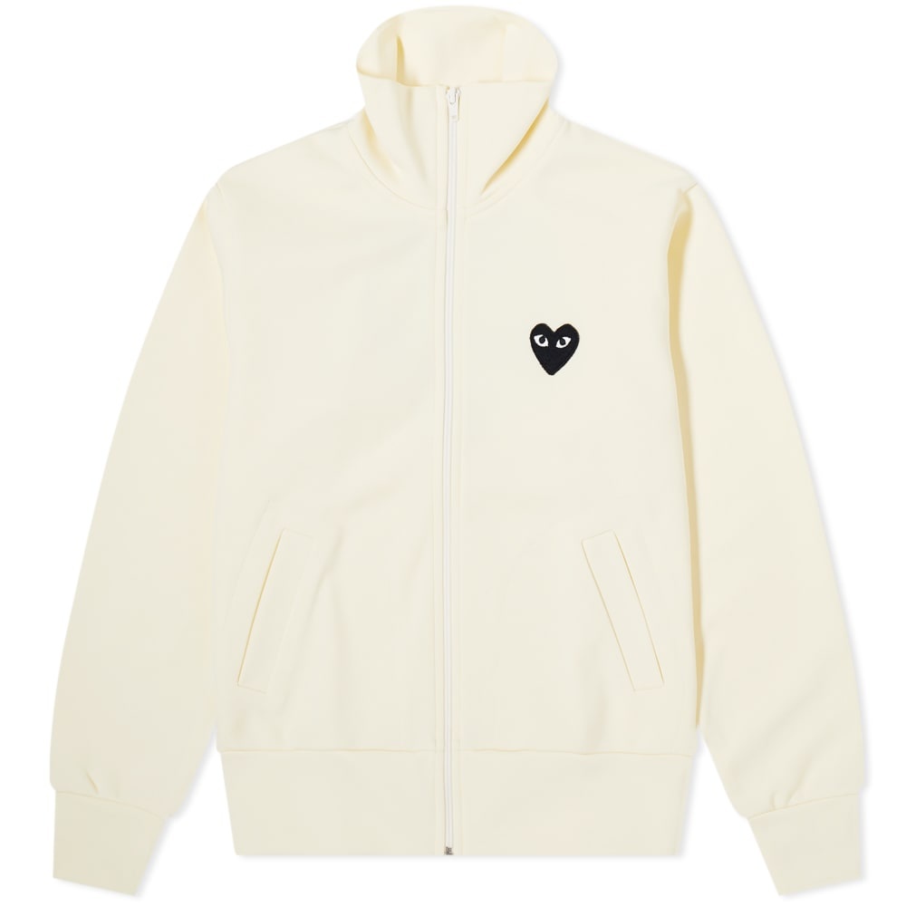 Wearing Comme des Garçons PLAY’s iconic heat mascot at its chest and back, this funnel-necked track top is delivered in a clean ivory colourway. Secured with a full-length YKK zipper, this comfortable, Japanese-made women’s staple is completed with ergonomic ribbed trims at its cuffs and hemline. - 100% Polyester - Funnel Neck - Zip Closure - Heart Appliqué - Heart Back Print - 2 Angled Welt Pockets - Ribbed Cuffs & Hem - Made in Japan