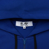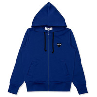 The concept of the Comme des Garcons PLAY line is design by not designing. Characterized by the iconic red heart logo designed by artist Filip Pagowski, the line is a collection of unisex basics, fragrances, and footwear for those who enjoy simplicity. Pictured is the Comme des Garcons Play Women's Big Black Heart Hooded Sweatshirt in Navy. AZ T253 051 2 COMME DES GARCONS PLAY APPAREL HAS A SMALLER FIT, WE RECOMMEND SIZING UP. - 100% Polyester - Embroidered branding - Zipper closure - Ribbed edges - Made in Japan - Style no: AZ-T253-051-2