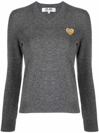 Womens V-Neck Pullover with Gold Heart in Med Grey from Comme des Garcons Play Highlights - grey - wool - V-neck - embroidered gold heart logo - long sleeves - ribbed hem and cuffs Please, note that CDG Play womens sizing runs small. We recommend ordering one size up. Made in Japan Composition: 100% Wool Washing instructions: Dry Clean Only Designer ID: P1N047