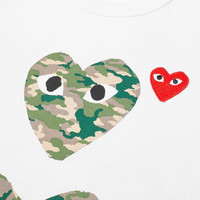 This camo-trimmed women's tee from Comme des Garçons PLAY is covert and cute in equal measure. Crafted with care in Japan, it's signed off with Filip Pagowski’s signature heart logos, appliquéd and printed at the chest. - 100% Cotton - Ribbed Crewneck - Heart Appliqué - Heart Print - Made in Japan