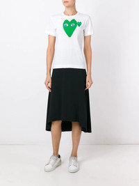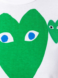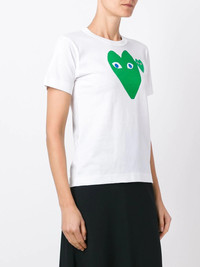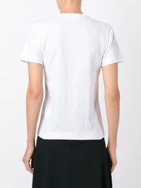 logo print T-shirt White cotton logo print T-shirt from Comme Des Garcons Play. Imported Composition Cotton 100% SIZE & FIT Model measurements Height 5 ft 9 in(1.76 m) Bust/Chest 29.92 in(76 cm) Hips 34.64 in(88 cm) Waist 24.01 in(61 cm) Measurement SLEEVE LENGTH 6.69 in(17 cm) LENGTH 21.25 in(54 cm) BUST 30.7 in(78 cm) Shoulder Width 12.59 in(32 cm) FittingInformation Designed for a relaxed fit, this piece allows for comfort and movement when worn Made from a midweight non-stretch fabric, this piece offers minimal elasticity when worn This piece fits small – take one size up Washing instructions Hand Wash