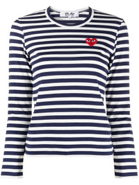 Navy blue/white cotton striped print long-sleeve T-shirt from COMME DES GARÇONS PLAY featuring round neck, long sleeves, stripe print and logo patch to the front. Size & Fit Model Measurements: Height: 1,75 m Bust/Chest: 82 cm Hips: 94 cm Waist: 66 cm Model wears size S Fabric and Care Designer Style ID: P1T009 Designer Colour: 1 NAVY/WHITE Composition: Cotton 100% Washing instructions: Hand Wash Made in Japan