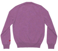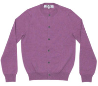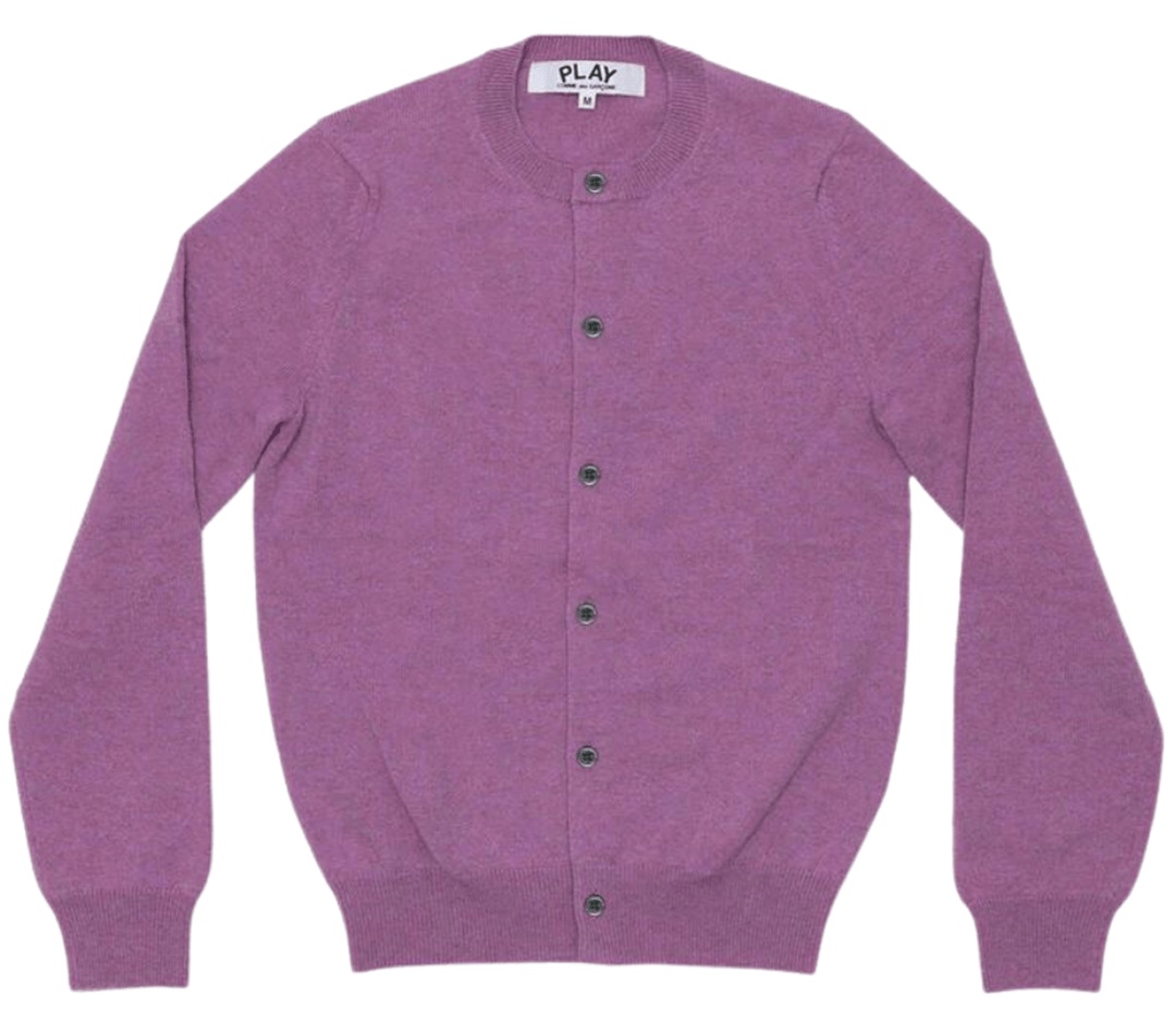 COMME des GARCONS PLAY Ladies' Lambswool Cardigan Wrap yourself in cozy sophistication with this woolen cardigan from COMME des GARCONS PLAY, boasting a pastel purple hue. The subtle charm of a small heart patch adorning the sleeve elevates this minimalist masterpiece, adding a touch of playfulness to your wardrobe that perfectly exudes the brand's aesthetic. - 100% Wool - Purple - Crew neck - Long sleeves - Fine knit - Small red heart embroidered - Ribbed trim - Front button fastening - Straight hem - Hem hits at hips - Regular fit