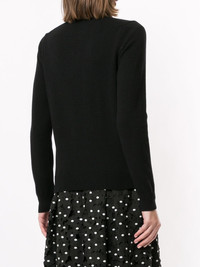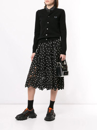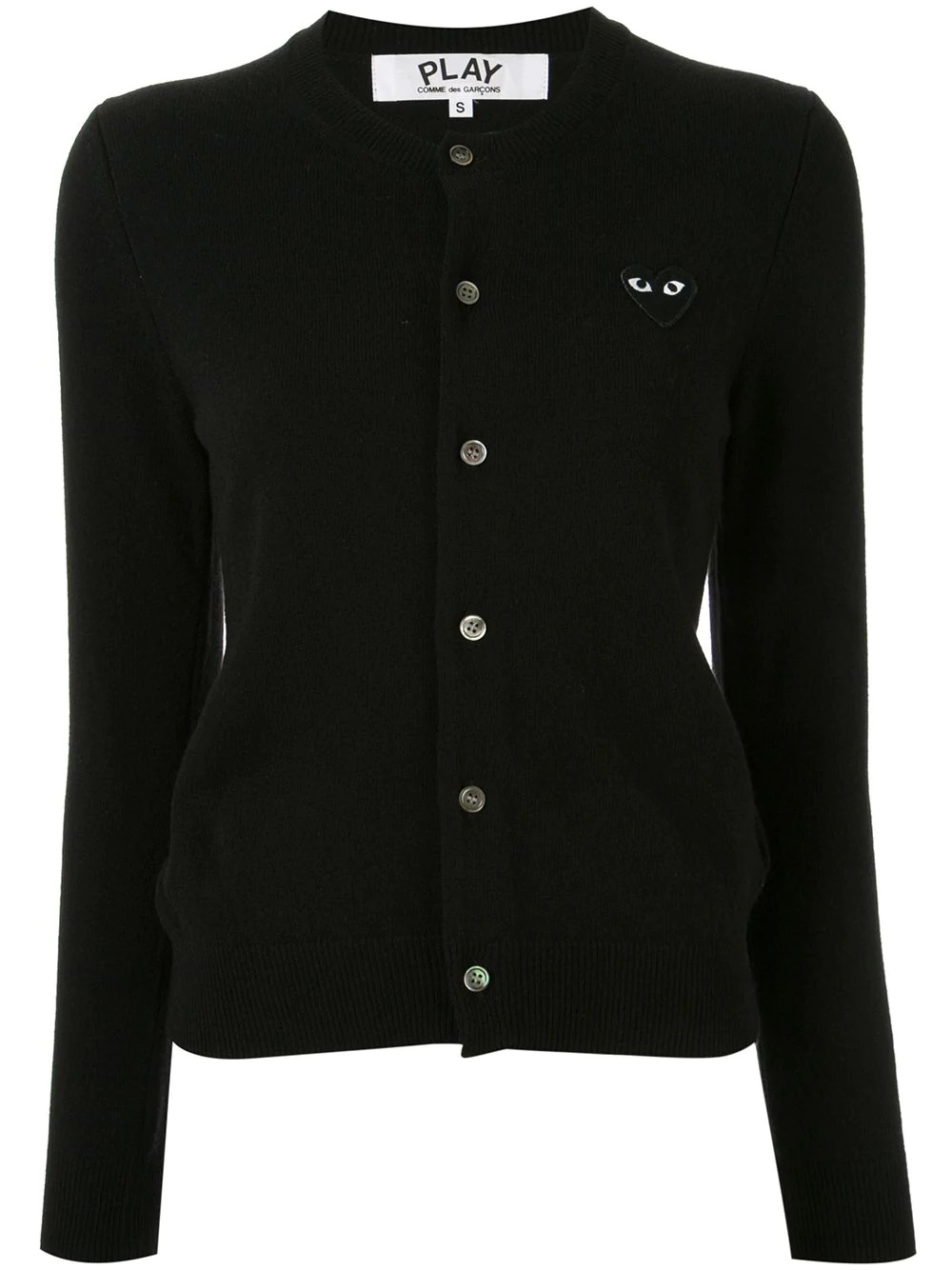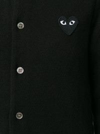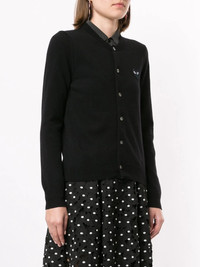 logo embroidered buttoned cardigan Black wool logo embroidered buttoned cardigan from Comme Des Garçons Play featuring ribbed trimming, a front logo patch, a crew neck, a front button fastening, long sleeves and a straight hem. Imported Composition Wool 100% SIZE & FIT Model measurements Height 5 ft 9 in(1.76 m) Bust/Chest 29.13 in(74 cm) Hips 33.07 in(84 cm) Waist 22.83 in(58 cm) FittingInformation This piece fits true to size. We recommend you get your regular size Cut for a slim fit Made with a mid-weight fabric