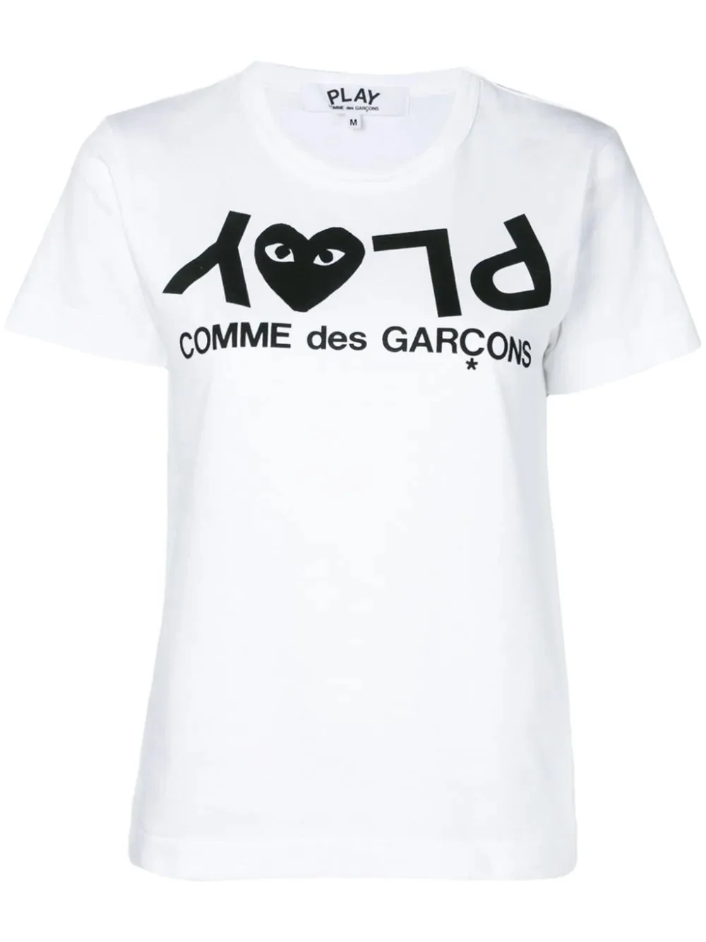 logo print T-shirt The trademark design of Comme Des Garcons' Rei Kawakubo’s almond-eyed heart print is switched up with this white cotton logo print T-shirt from Comme Des Garcons Play featuring a round neck, short sleeves and a straight hem. Imported Composition Cotton 100% SIZE & FIT Model measurements Height 5 ft 9 in(1.76 m) Bust/Chest 33.07 in(84 cm) Hips 35.03 in(89 cm) Waist 24.4 in(62 cm) Measurement BUST 32.28 in(82 cm) LENGTH 22.44 in(57 cm) SLEEVE LENGTH 7.87 in(20 cm) Shoulder Width 13.77 in(35 cm) Washing instructions Hand Wash