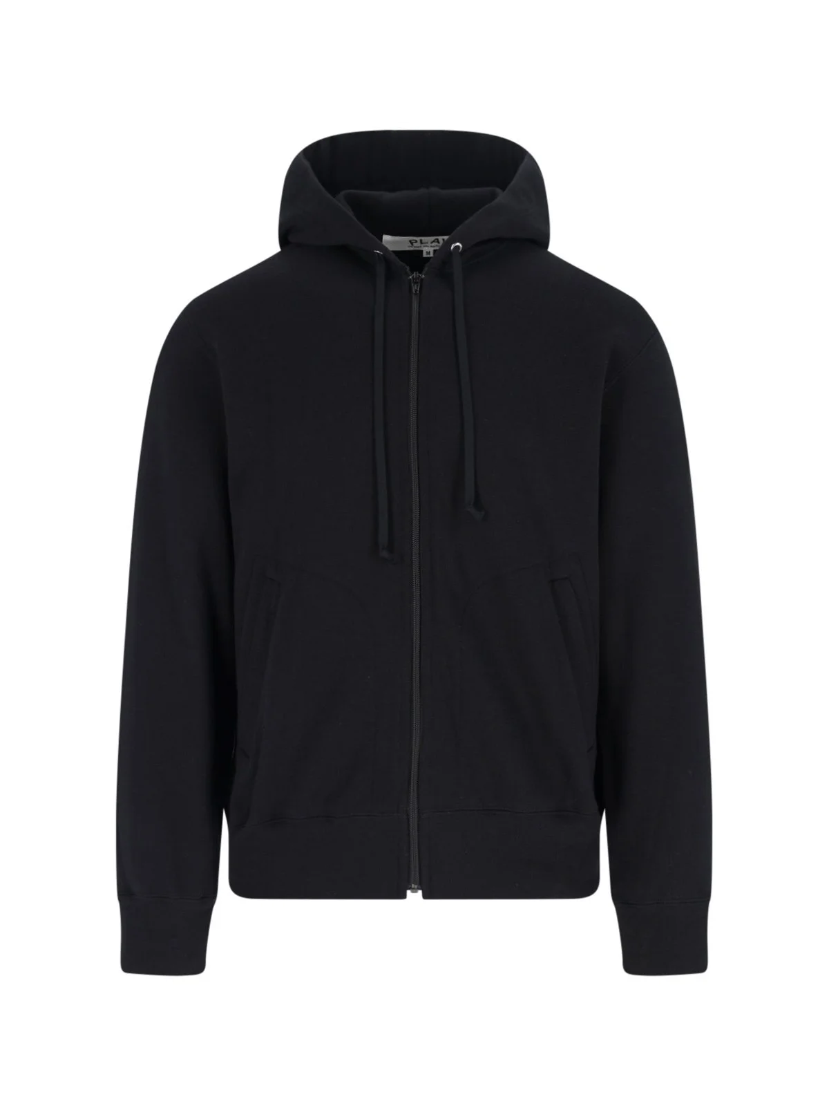 COMME DES GARCONS PLAY LOGO ZIP SWEATSHIRT IN BLACK COTTON WITH DRAWSTRING HOOD, LOGO EMBROIDERY AT THE BACK, TWO FRONT POCKETS, RIBBED TRIM, AND STRAIGHT HEM. PRODUCT INFO PRODUCT CODE AX T342 0511 COMPOSITION: 100% COTTON SIZE AND FIT: REGULAR FIT MADE IN: JAPAN