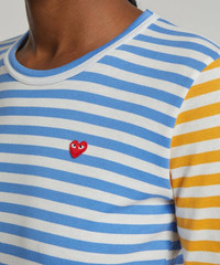 Editor's Notes Comme des Garçons PLAY’s instantly recognisable heart logo adorns this dual-coloured striped shirt . Cut from cotton jersey with long-sleeves and a ribbed crew-neck collar, it boasts a contrasting yellow and blue striped bi-colour design, complete with the iconic heart logo appliquéd in red on the chest. Features Long-Sleeve T-Shirt Regular fit Ribbed crew-neckline Long-sleeves Bi-colour yellow and blue striped design Appliquéd heart logo at chest Made in Japan SIZE & FIT Model is 175cm/5'9"; Chest: 84cm; Waist 65cm; Hip: 92cm and wears a size S Composition & Care 100% Cotton Machine washable About Comme des Garçons Play Instantly recognisable the world over, Comme des Garçons PLAY’s red heart-with-eyes logo was created by Polish artist Filip Pagowski. PLAY launched in 2002 and is designed by Comme des Garçons founder Rei Kawakubo. Snubbing traditional fashion seasons, the label produces playful, often logo-adorned ready-to-wear, alongside sought-after collaborations with other artists and creatives.