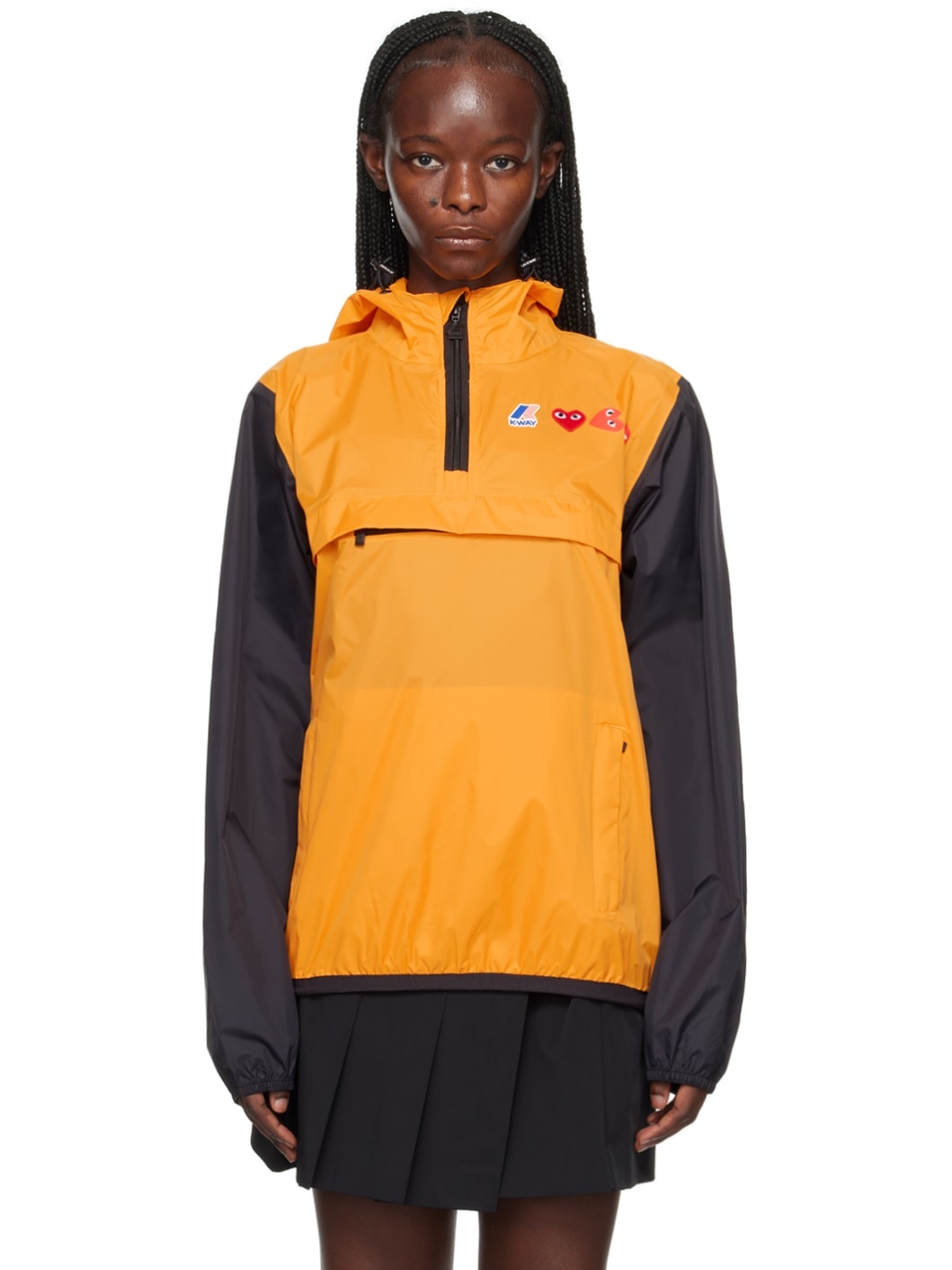 Paneled nylon ripstop jacket. · Bungee-style drawstring at hood · Stand collar · Half-zip closure · Logo and graphics printed at chest · Embroidered graphic patch at chest · Zip pockets · Concealed bungee-style drawstring at hem · Elasticized cuffs · Storm flap at back · Unlined · Logo-engraved black hardware Part of the Comme des Garçons Play x K-Way collaboration. Supplier color: Orange/Black