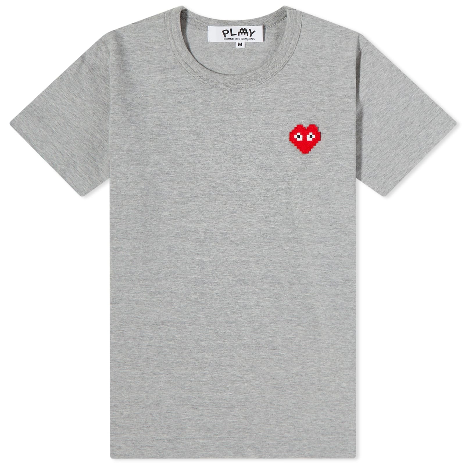 The Filip Pagowski-designed heart hasn't gone, but it is pixelated for the CdG PLAY x Invader collab. The anonymous French street artist uses Comme des Garçons Play's basic cotton t-shirt to display his artwork - pixelating the bug-eyed heart like the video game Space Invaders. - 100% Cotton - Ribbed Crewneck - Applique Branding - Made in Japan
