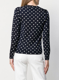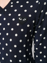 polka-dot knit sweater Laid-back style with a playful twist is the look at Comme Des Garcons Play. Presenting this navy blue wool polka-dot knit sweater from Comme Des Garcons Play. Featuring a v-neck, long sleeves and a ribbed hem and cuffs. Imported Composition Wool 100% SIZE & FIT Model measurements Height 5 ft 9 in(1.76 m) Bust/Chest 31.88 in(81 cm) Hips 37 in(94 cm) Waist 25.19 in(64 cm) FittingInformation This piece fits true to size. We recommend you get your regular size Made with a mid-weight stretch fabric Washing instructions Dry Clean Only