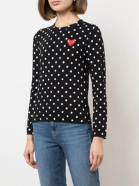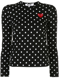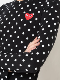 polka dot T-shirt Black 100% cotton polka dot T-shirt from Comme Des Garcons Play featuring a polka dot pattern, a crew neck and long sleeves. Imported Composition Cotton 100% SIZE & FIT Model measurements Height 5 ft 10 in(1.77 m) Bust/Chest 33.85 in(86 cm) Hips 35.03 in(89 cm) Waist 24.01 in(61 cm) Measurement BUST 29.13 in(74 cm) FittingInformation Designed for a relaxed fit, this piece allows for comfort and movement when worn Made from a midweight non-stretch fabric, this piece offers minimal elasticity when worn This piece fits small – take one size up Washing instructions Hand Wash