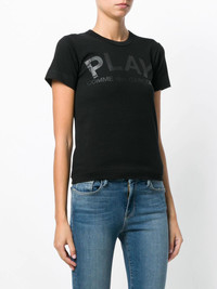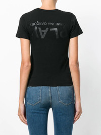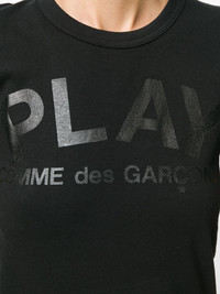 printed T-shirt Black cotton printed T-shirt from Comme Des Garcons Play. Imported Composition Cotton 100% SIZE & FIT Model measurements Height 5 ft 11 in(1.81 m) Bust/Chest 32.28 in(82 cm) Hips 34.64 in(88 cm) Waist 24.01 in(61 cm) FittingInformation Designed for a relaxed fit, this piece allows for comfort and movement when worn Made from a midweight non-stretch fabric, this piece offers minimal elasticity when worn This piece fits small – take one size up Washing instructions Hand Wash