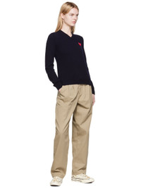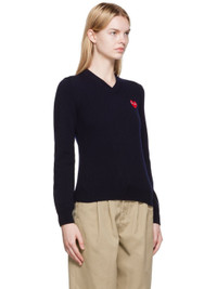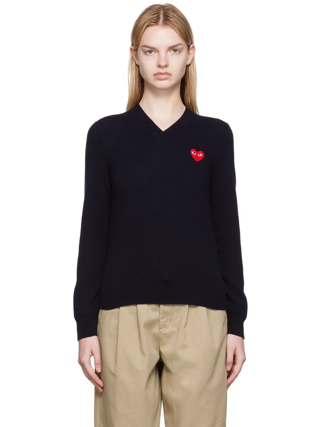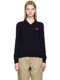 Knit wool sweater. · Rib knit V-neck, cuffs, and hem · Embroidered logo patch at chest Supplier color: Navy 100% wool.