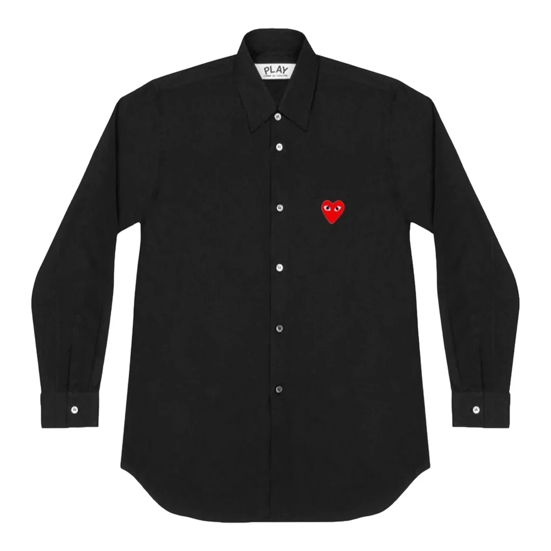 600050220BLKXXS / A-AX-B002/051/1 - Classic point collar - Long sleeves with button cuffs - Full button front closure - Iconic red heart logo on chest - Premium cotton poplin construction - Regular fit - Curved hem COMME des GARCONS PLAY Red Heart Shirt delivers iconic Japanese minimalism with the brand's signature romantic rebellion. Crafted from premium cotton poplin in classic black, featuring the iconic red heart logo with eyes designed by Filip Pagowski. The clean tailoring and distinctive branding create a timeless piece that bridges avant-garde fashion with everyday wearability.