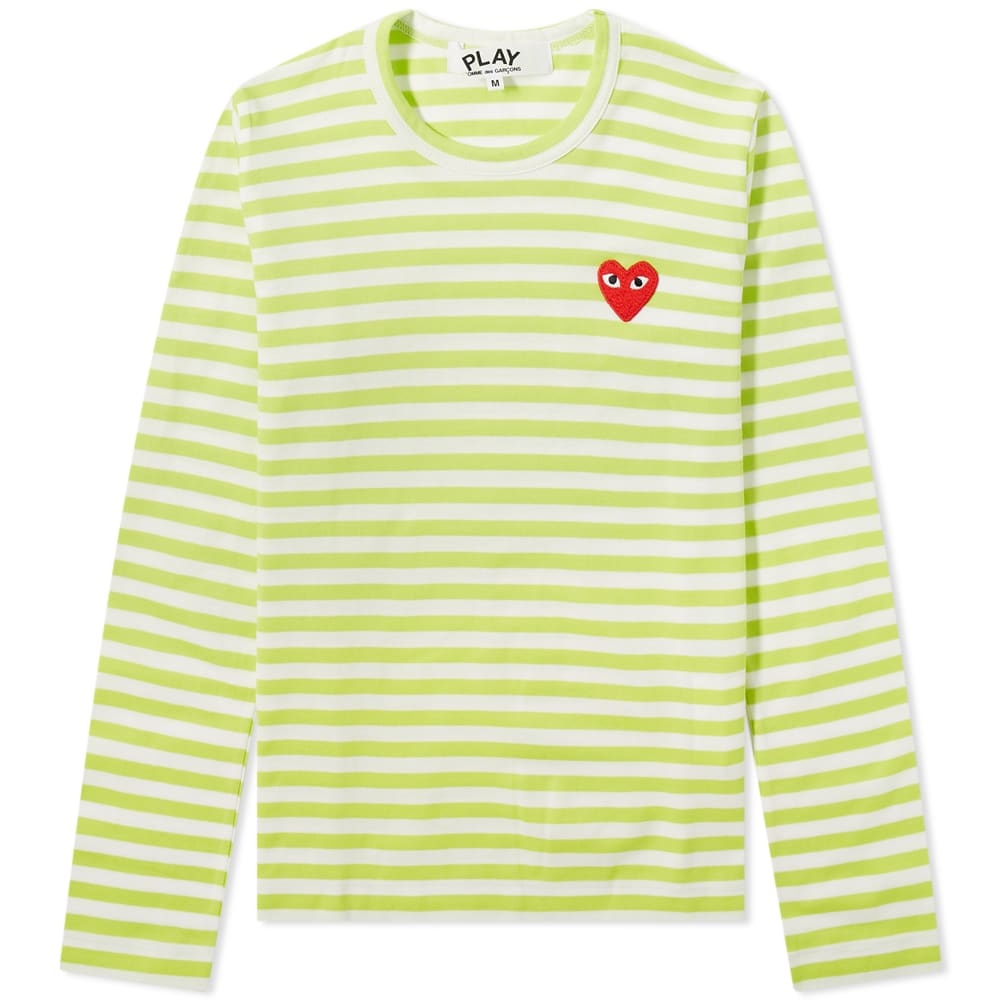 Rei Kawakubo’s playfulness shows in every Comme des Garçons PLAY piece. This women’s long-sleeved tee is cut from raw Japanese cotton that’s striped in white and lime green, then patched with the usual bug-eyed heart logo. - 100% Cotton - Ribbed Crewneck - Appliqué Branding - Made in Japan
