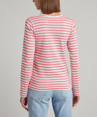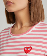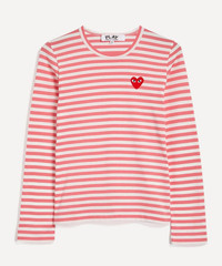 Editor's Notes Comme des Garçons PLAY’s instantly recognisable, heart logo is printed at the chest of this long-sleeve cotton t-shirt . Comme des Garçons PLAY creates well-tailored wardrobe basics – often the brand’s ubiquitous heart-with-eyes logo patch can be spotted peeping from the piece. This t-shirt is cut from striped cotton in a crew-neck style. The heart logo appears at the chest - pair with rolled-up chinos and white sneakers. Features Long-sleeve t-shirt Striped Crew-neck Heart logo at chest Relaxed fit SIZE & FIT Model is 175cm/5’9”; Chest:81cm; Waist: 61cm; Hip: 89cm and wears size S Composition & Care 100% Cotton Hand wash or dry clean only About Comme des Garçons Play Instantly recognisable the world over, Comme des Garçons PLAY’s red heart-with-eyes logo was created by Polish artist Filip Pagowski. PLAY launched in 2002 and is designed by Comme des Garçons founder Rei Kawakubo. Snubbing traditional fashion seasons, the label produces playful, often logo-adorned ready-to-wear, alongside sought-after collaborations with other artists and creatives.