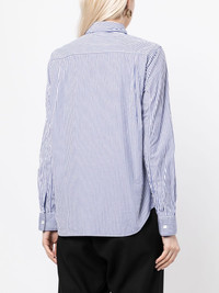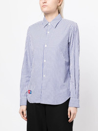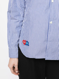 x Invader pixelated-heart striped shirt x Invader pixelated-heart striped shirt from COMME DES GARCONS PLAY featuring blue/white, cotton, vertical stripe pattern, signature heart patch, classic collar, front button fastening, long sleeves, buttoned cuffs and curved hem. Imported Composition Cotton 100% SIZE & FIT Model measurements Height 5 ft 9 in(1.76 m) Bust/Chest 31.1 in(79 cm) Hips 35.03 in(89 cm) Waist 24.4 in(62 cm) Washing instructions Machine Wash