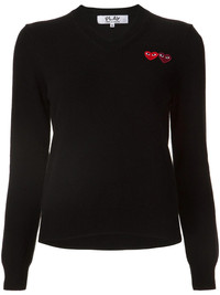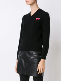v neck jumper Black wool v neck jumper from Comme Des Garcons Play. Imported Composition Wool 100% SIZE & FIT Model measurements Height 5 ft 10 in(1.77 m) Bust/Chest 29.92 in(76 cm) Hips 35.82 in(91 cm) Waist 24.01 in(61 cm) FittingInformation This piece fits small – you might want to get one size up Measurement SLEEVE LENGTH 24.01 in(61 cm) LENGTH 22.51 in(57.2 cm) WAIST 34.01 in(86.4 cm) BUST 35 in(88.9 cm) Washing instructions Dry Clean Only