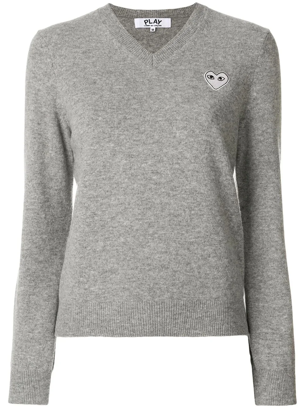 V-neck pullover Grey wool V-neck pullover from Comme Des Garcons Play. Imported Composition Wool 100% SIZE & FIT Model measurements Height 5 ft 10 in(1.77 m) Bust/Chest 32.67 in(83 cm) Hips 35.03 in(89 cm) Waist 24.4 in(62 cm) Measurement BUST 30 in(76.2 cm) LENGTH 20.51 in(52.1 cm) WAIST 29.01 in(73.7 cm) SLEEVE LENGTH 20.98 in(53.3 cm) Washing instructions Dry Clean Only