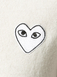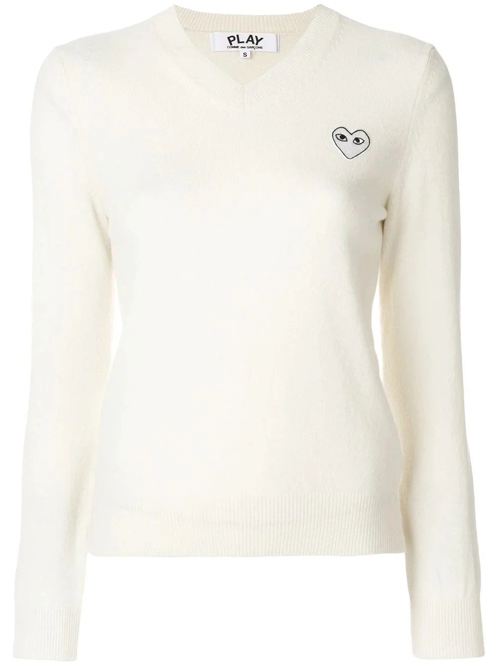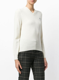 V-neck pullover White wool V-neck pullover from Comme Des Garcons Play. Imported Composition Wool 100% SIZE & FIT Model measurements Height 5 ft 10 in(1.77 m) Bust/Chest 32.67 in(83 cm) Hips 35.03 in(89 cm) Waist 24.4 in(62 cm) Measurement SLEEVE LENGTH 20.98 in(53.3 cm) LENGTH 20.51 in(52.1 cm) WAIST 29.01 in(73.7 cm) BUST 30 in(76.2 cm)