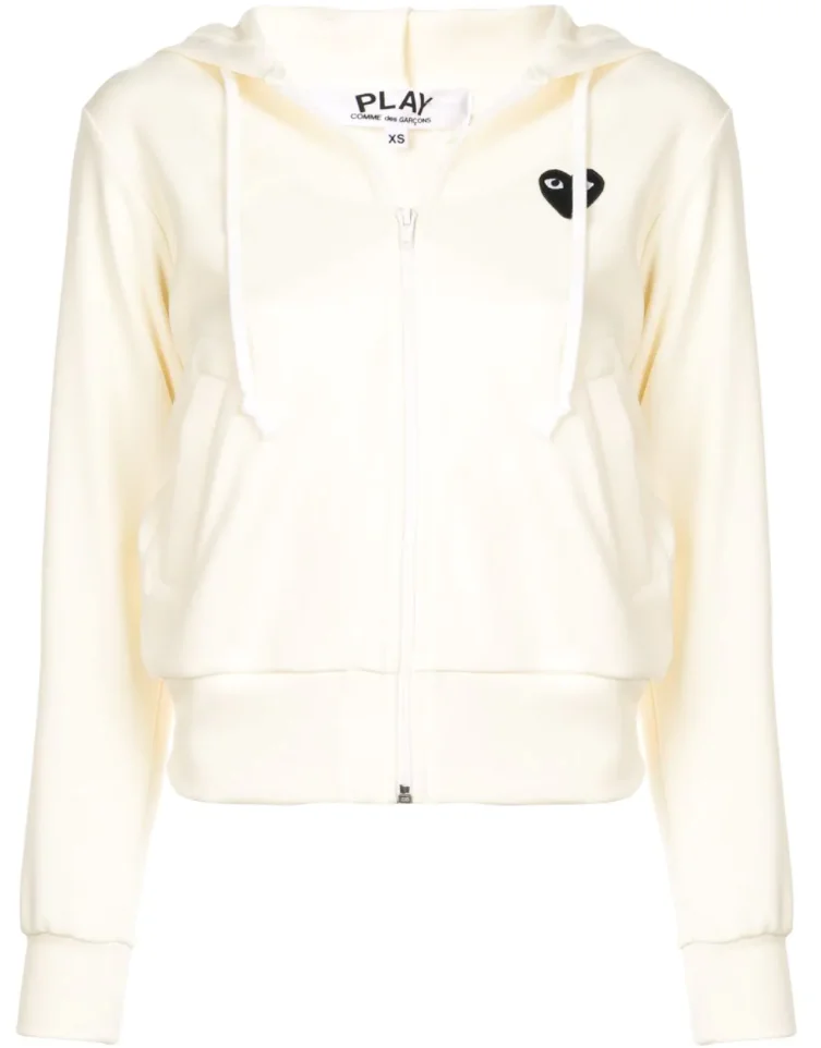 Womens Zipped Hoodie Black Heart in Ivory from Comme Des Garcons Play. Featuring a front zip fastening, long sleeve, a cropped length and black heart design on the back. Designer ID: P1T253
