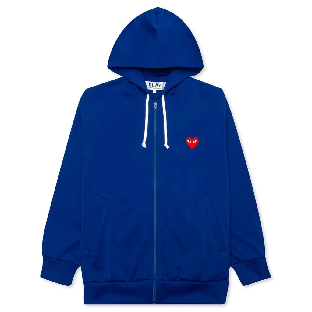 The concept of the Comme des Garcons PLAY line is design by not designing. Characterized by the iconic red heart logo designed by artist Filip Pagowski, the line is a collection of unisex basics, fragrances, and footwear. Pictured is the Comme des Garcons PLAY Zip Up in Blue. AZ T172 051 2 COMME DES GARCONS PLAY APPAREL HAS A SMALLER FIT, WE RECOMMEND SIZING UP. condition: new - 100% Polyester - Ribbed trims - Drawstring hood - Zip closure - Embroidered CDG heart logo - Made in Japan - Style No: AZ-T171-051-2