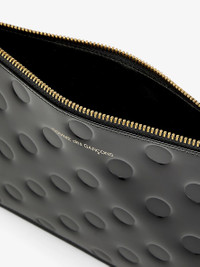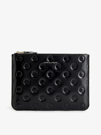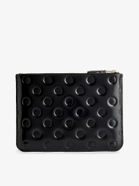 PRODUCT DETAILS - Commes des Garçons leather pouch - 100% leather - Zip fastening - Rectangular shape, foiled branding at front, all-over debossed circular pattern, gold-toned hardware, one main compartment - Height 16.5cm, width 23cm - Specialist leather clean - Made in Spain - Presented in a box
