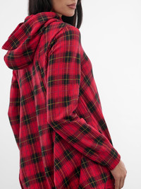 A red and black tartan hoodie with asymmetric draping. The off-set zip and elongated length reimagine a classic plaid layer with sculptural fluidity. Featuring: • Relaxed fit • Cotton construction • Tartan plaid pattern • Asymmetric draping throughout • Hood with adjustable drawstring • Off-set zip closure • Long sleeves • Long length • Made in Japan • 100% Cotton • Standard sizing Model is 5'8" wearing size S. Bust: 32" Waist: 26" Hips: 34.5"