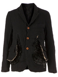 ruffle detailed jacket Black jacket from Comme Des Garcons featuring notched lapels, a button fastening, front flap pockets with ruffled panels, a rear central vent, long sleeves and button cuffs. Imported Composition Polyester 100% Washing instructions Dry Clean Only