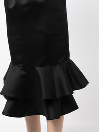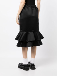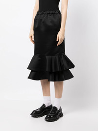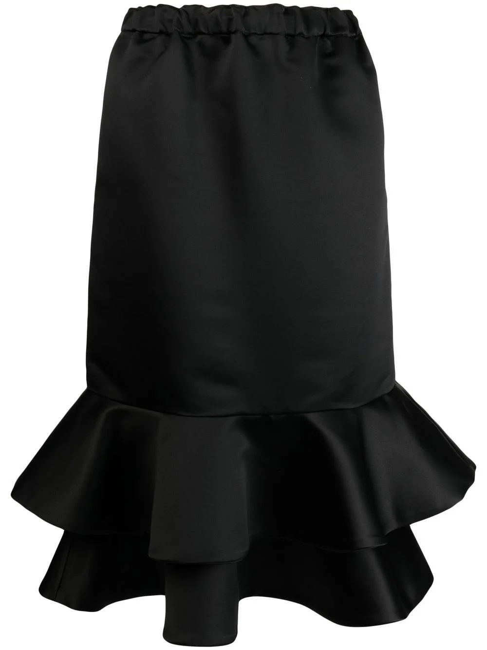 ruffled midi skirt black elasticated waistband below-knee length ruffle hem Imported Composition Polyester 100% SIZE & FIT Model measurements Height 5 ft 11 in(1.8 m) Bust/Chest 28.34 in(72 cm) Hips 35.43 in(90 cm) Waist 23.62 in(60 cm) FittingInformation This piece fits true to size. We recommend you get your regular size Designed to be fitted at the waist and through the thigh, loose from the knee Made with a mid-weight non-stretch fabric