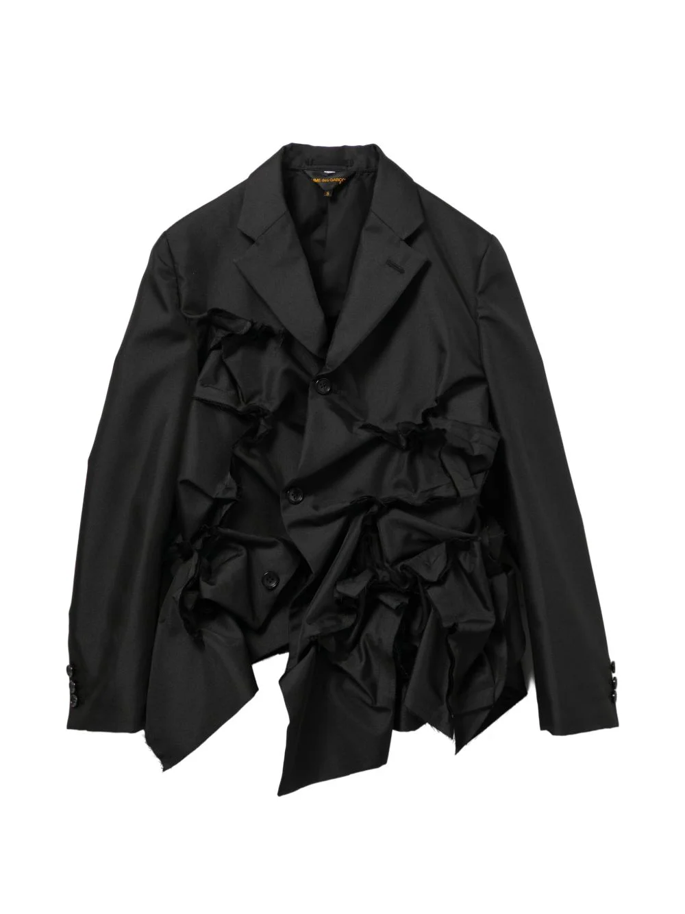 ruffled notched-lapels jacket Highlights - Black - Ruffles - Button fastening - Notched lapels - Long sleeves - Buttoned cuffs Imported Composition Polyester 100% Washing instructions Dry Clean Only