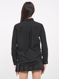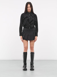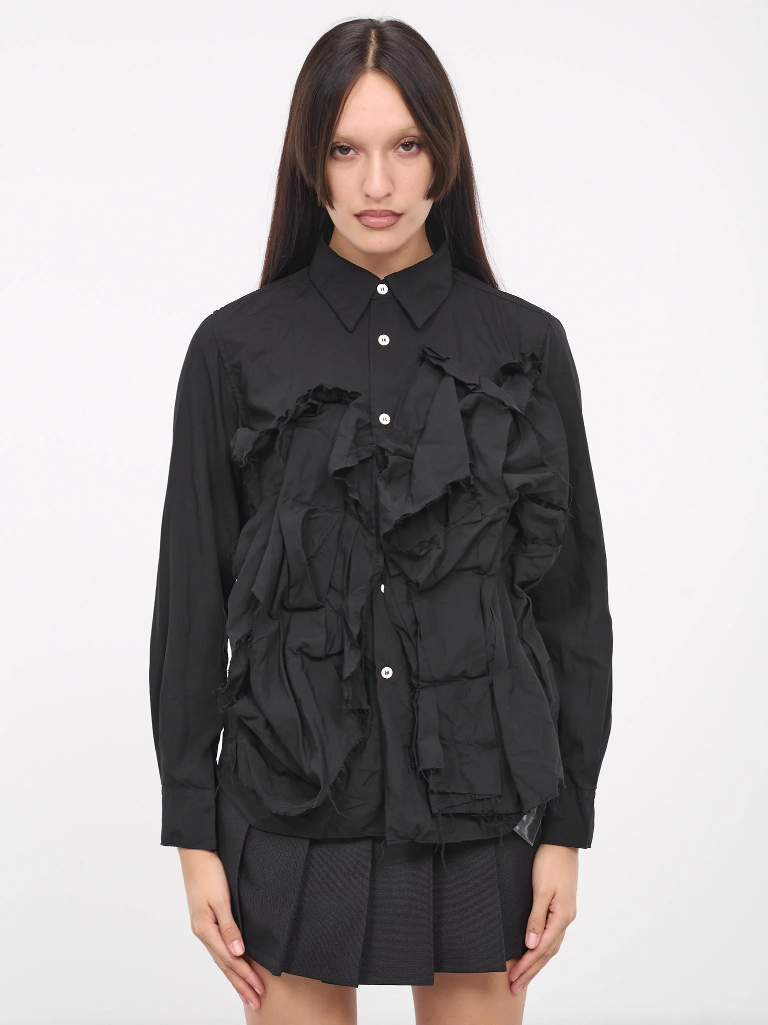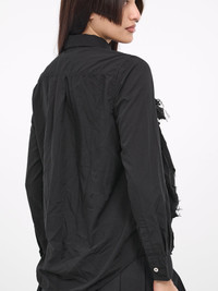 COMME DES GARÇONS black shirt, polyester construction, pointed collar, contrast button closure, raw-hem layered ruffle appliqué, back pleats, long sleeves, single-button barrel cuffs, shirttail hem, regular fit. Made in Japan 100% Polyester Standard Sizing Model is 5'8" wearing size S. Bust: 32" Waist: 26" Hips: 34.5"