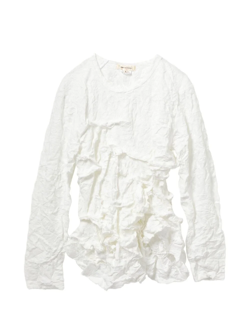 ruffled top Highlights - White - Textured finish - Crew neck - Long sleeves - Ruffled detail Imported Composition Polyester 100% Washing instructions Hand Wash