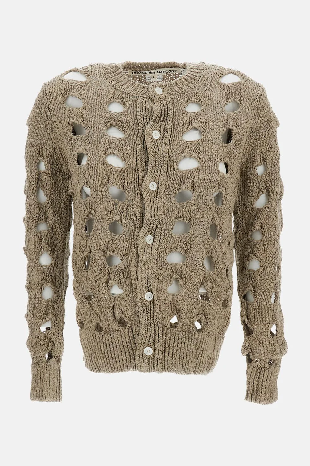 Perforated hemp cardigan Crew neck Long sleeves Full-length front button closure Ribbed trim on the neck, hem and cuffs Color: beige Details and Care Color: Beige Composition: 100% CA Made in: Cina Sku: GQN0050511