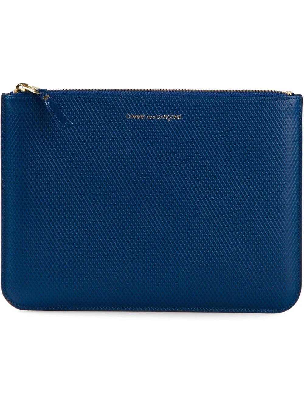 SA5100LG Wallet in Luxury Blue from Comme des Garcons Wallet Highlights - blue - embossed logo stamp in the front - gold-tone top zip closure - clutch/wallet - textured - one big compartment Measurements Length: 22 cm Width: 16 cm Thickness: 1.5 cm Made in Spain Designer ID: SA5100LG Materials 100% Cowhide For surface stains, we recommend wiping with a damp cloth.