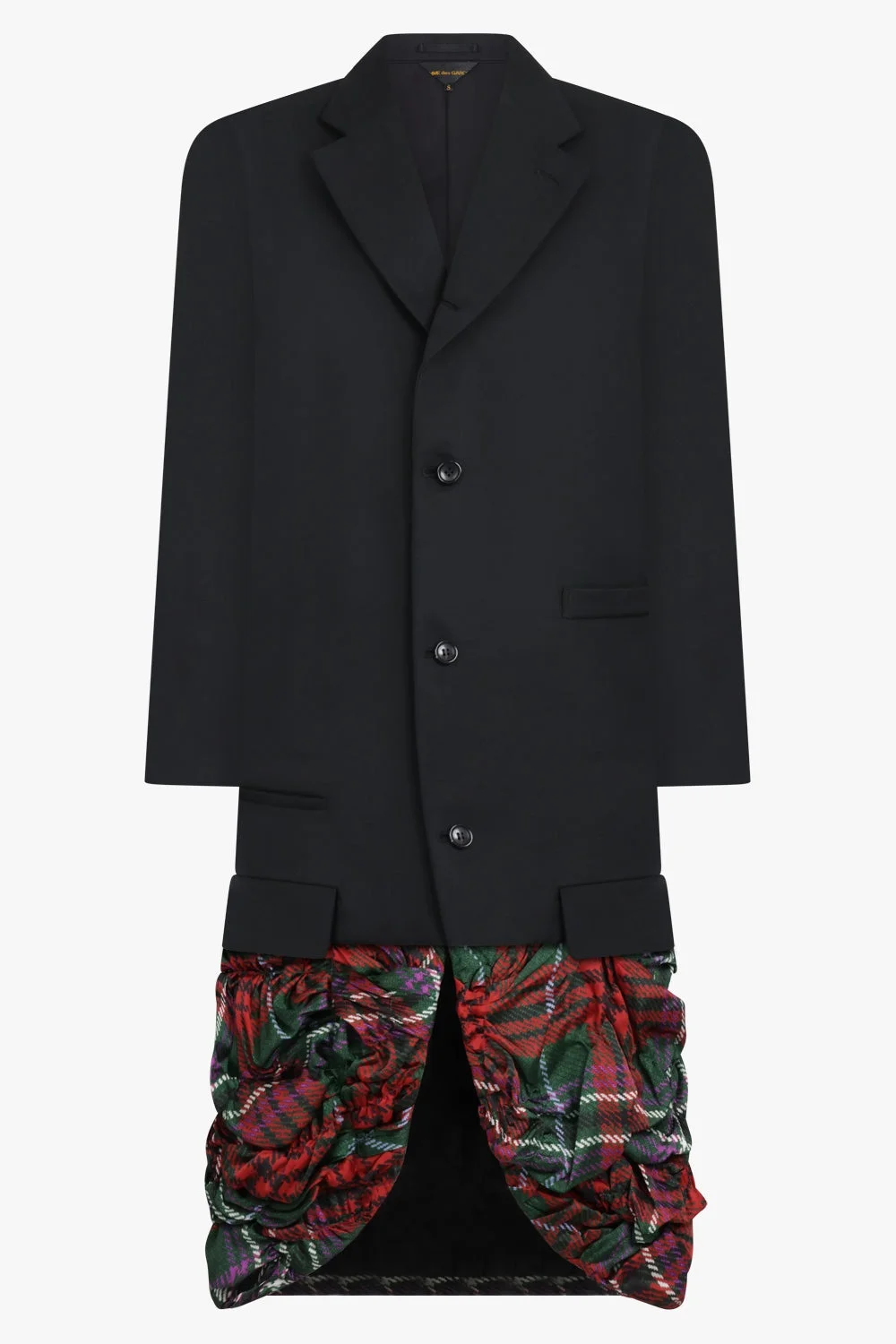 TWO TONE COAT WITH CHECK PRINT RUFFLE HEM | BLACK/TARTAN