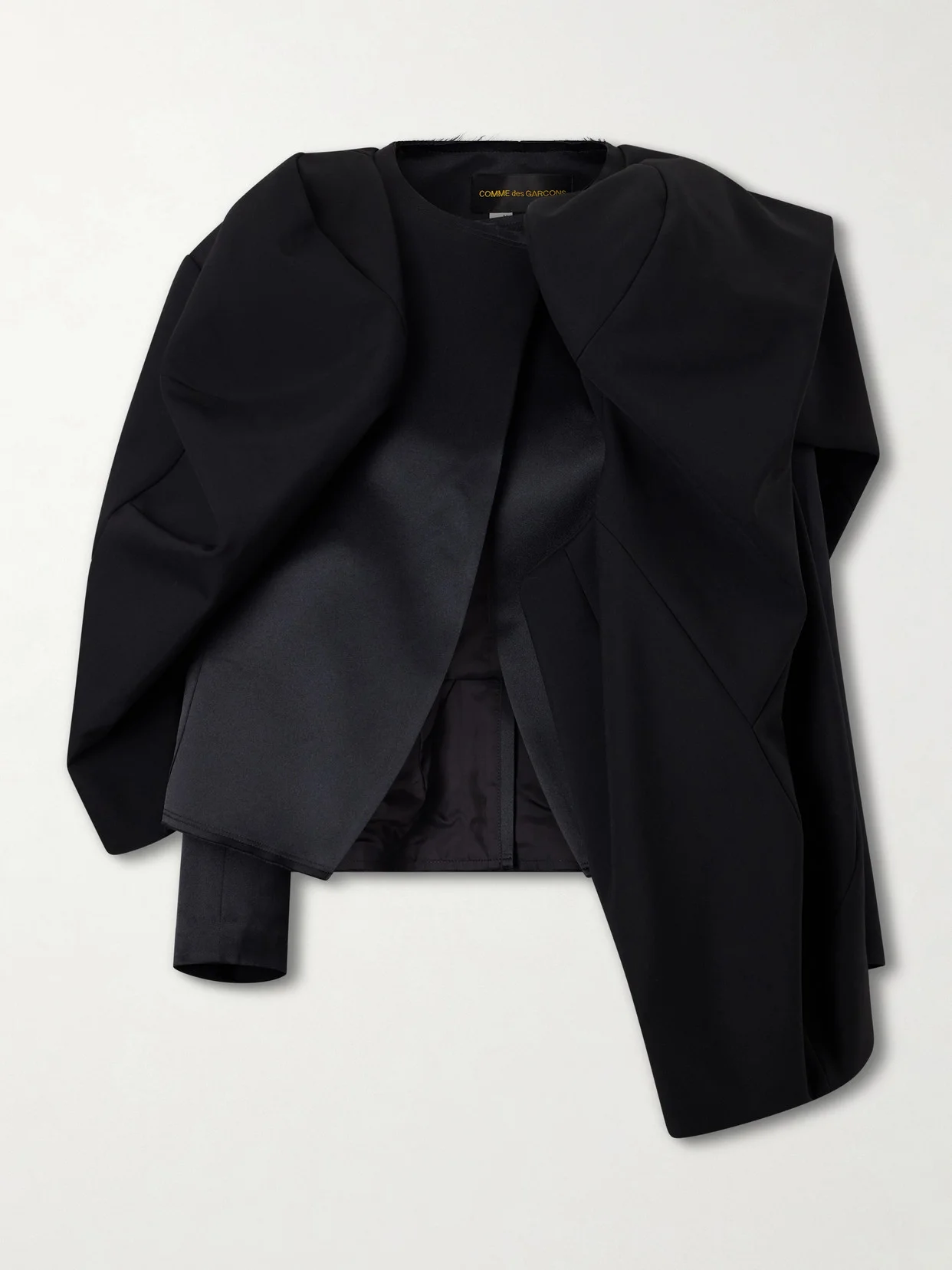 Comme des Garcons redefines wardrobe staples through architectural lines and textural contrast. Tailored from crepe in a close fit with a round neckline, this jacket is elevated by satin and wool appliques that add depth and volume. Wear it to complete your suit.
