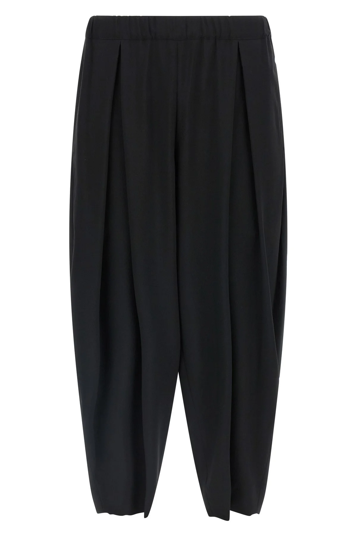 cod. GQP0151 Light wool trousers, loose egg-shaped leg, pinces, low crotch, drawstring elastic waistband, pockets. Color: Black Size & Fit: true to size fit Composition: 100% wool Made in: Japan